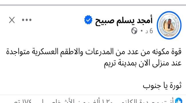 “قوة مكوّنة من عدد من المدرعات والأطقم العسكرية متواجدة عند منزلي الآن بمدينة تريم.. ثورة يا جنوب.”